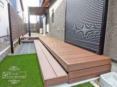 茨城県つくば市 庭リフォーム 樹脂デッキ 三協アルミ ヴィラウッド 目隠し樹脂フェンス グローベン プラドplus テラス屋根 LIXIL テラスSC |