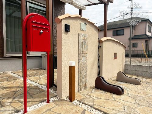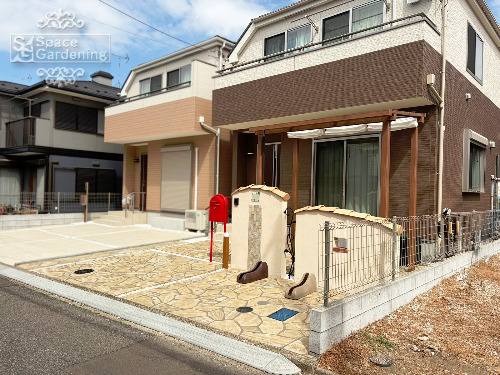 千葉県 船橋市 外構リニューアル 南欧風 テラス屋根 門袖 ローラーストーン ボビ